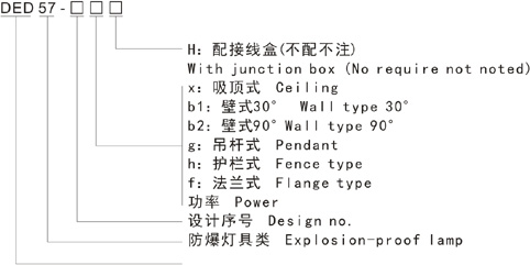 Note: 1. Select according to the product model description, pay attention to marking out the ex-mark; e.g.: Need product of 40W, 220V, pendant type, with junction box,gas explosion-proof, then the model should be DED57-40gH ExdIICT6 Gb;