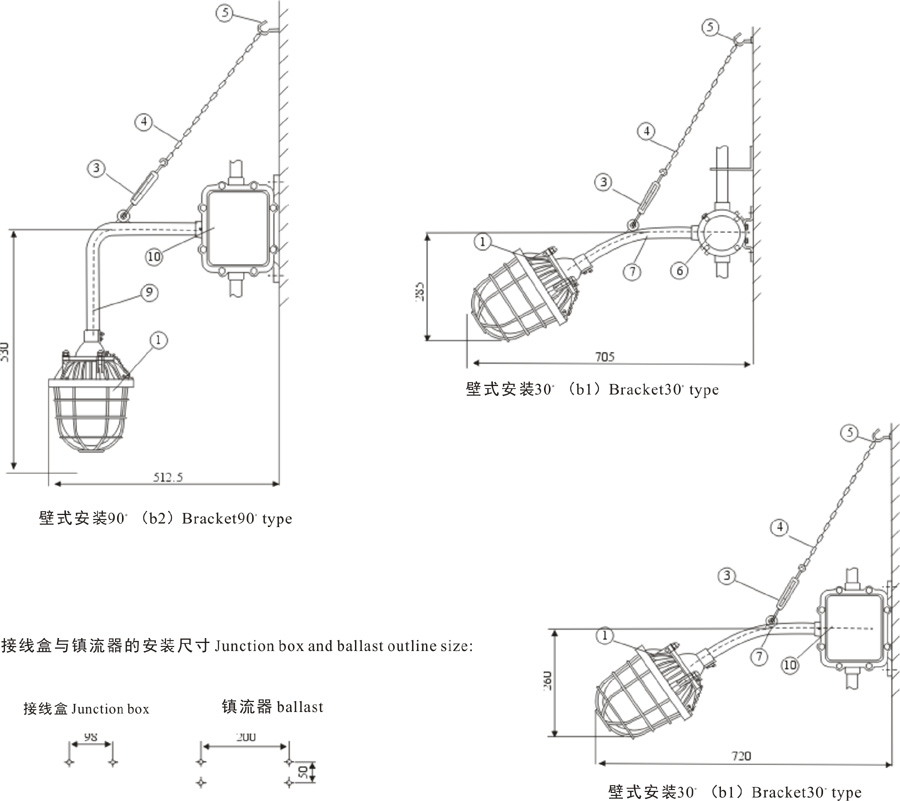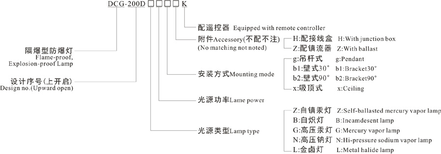 1、按產品型號說明逐條選擇,例:需配用光源為金鹵燈100W、吊桿式安裝、配接線盒、則產品型號為DCG200-DL100gH;