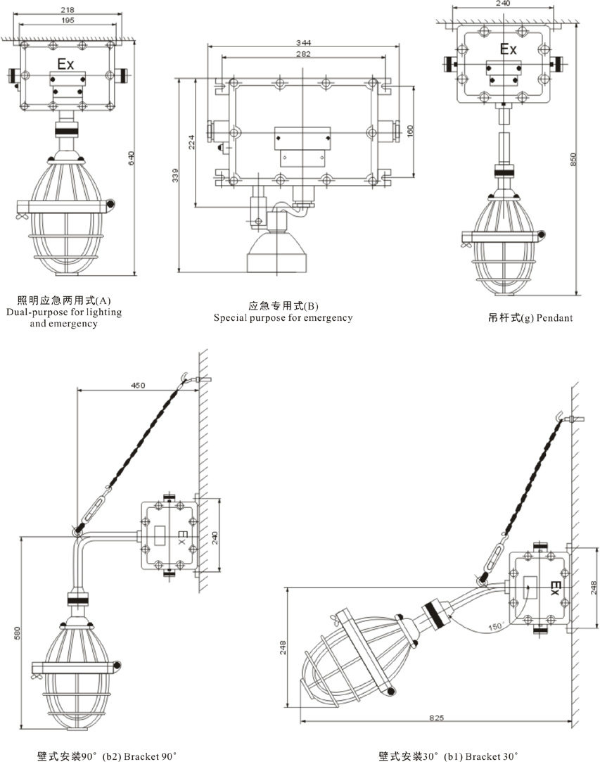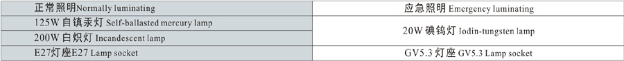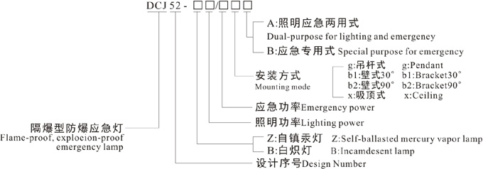 1、When purchasing, please refer to the model, name, illuminant, power and installation way of explosion-proof dual-purpose lamp for light and emergency. If a pendant type product with Self-ballasted mercury vapor lamp of 125W, its model shall be DCJ52-Z125gA.