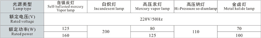 3、可配裝白熾燈、汞燈、高壓鈉燈、金鹵燈。