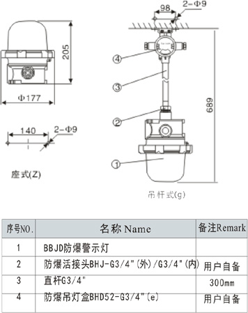 ◆吊桿式出廠時(shí),只配直桿G3/4"(300mm),若需防爆接線盒,防爆活接頭等配件,請(qǐng)另外注明。