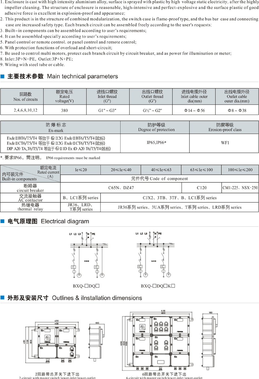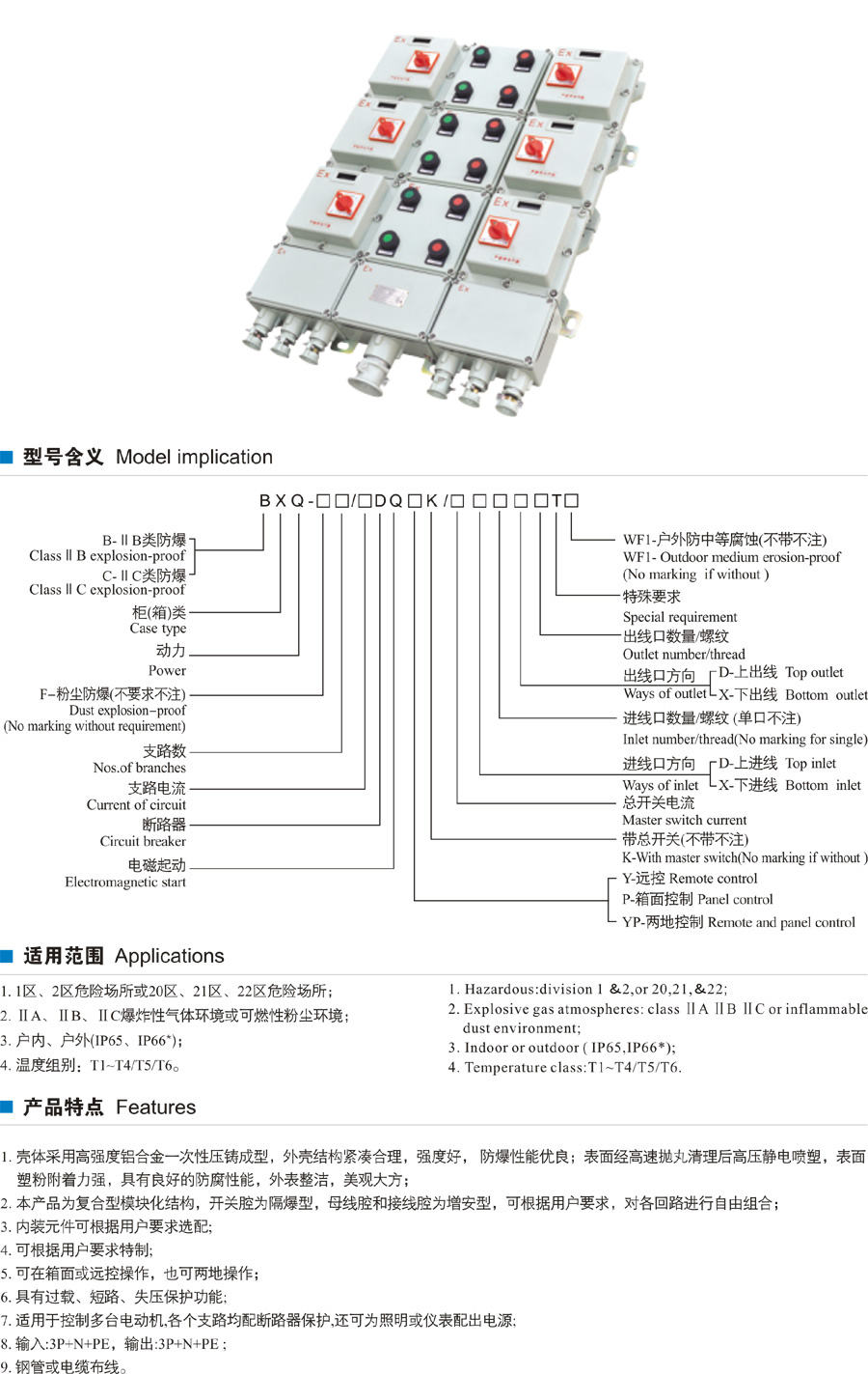 1、壓鑄鋁合金或鋼板焊接外殼,表面噴塑。 2、適用于控制多臺電動機,還可為照明或儀表配出電源。 3、內裝元件可根據用戶要求選配。 4、可在箱面或遠控操作,也可兩地操作。 5、具有過載、短路、失壓保護。 6、鋼管或電纜布線均可。">
