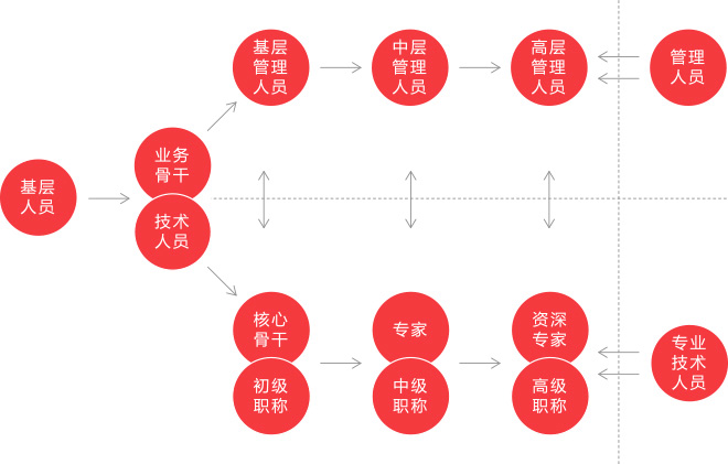 為所有員工提供管理與專業(yè)技術(shù)雙重職業(yè)發(fā)展通道(員工可以通過(guò)管理崗位或?qū)I(yè)技術(shù)通道獲得高報(bào)酬)。通過(guò)任職資格標(biāo)準(zhǔn)牽引、資格認(rèn)證推動(dòng)以及培訓(xùn)平臺(tái)支持,不斷幫助員工提升任職能力,使員工逐步勝任更高級(jí)別職位,從而實(shí)現(xiàn)員工職業(yè)發(fā)展的理想。